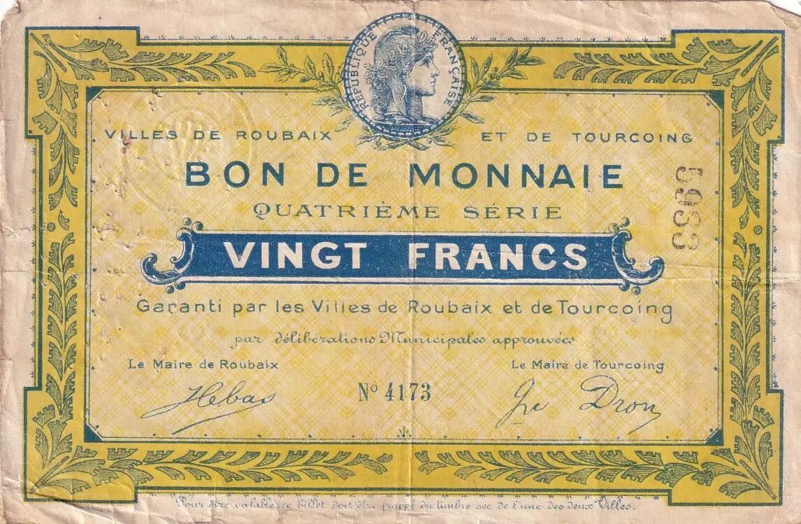 L'association des villes de Roubaix et Tourcoing sur ce billet témoigne d'une collaboration locale pour faire face aux difficultés économiques de l'époque. Ces deux villes, proches géographiquement et liées par leur histoire industrielle, ont uni leurs efforts pour émettre une monnaie locale et répondre aux besoins de leurs populations.