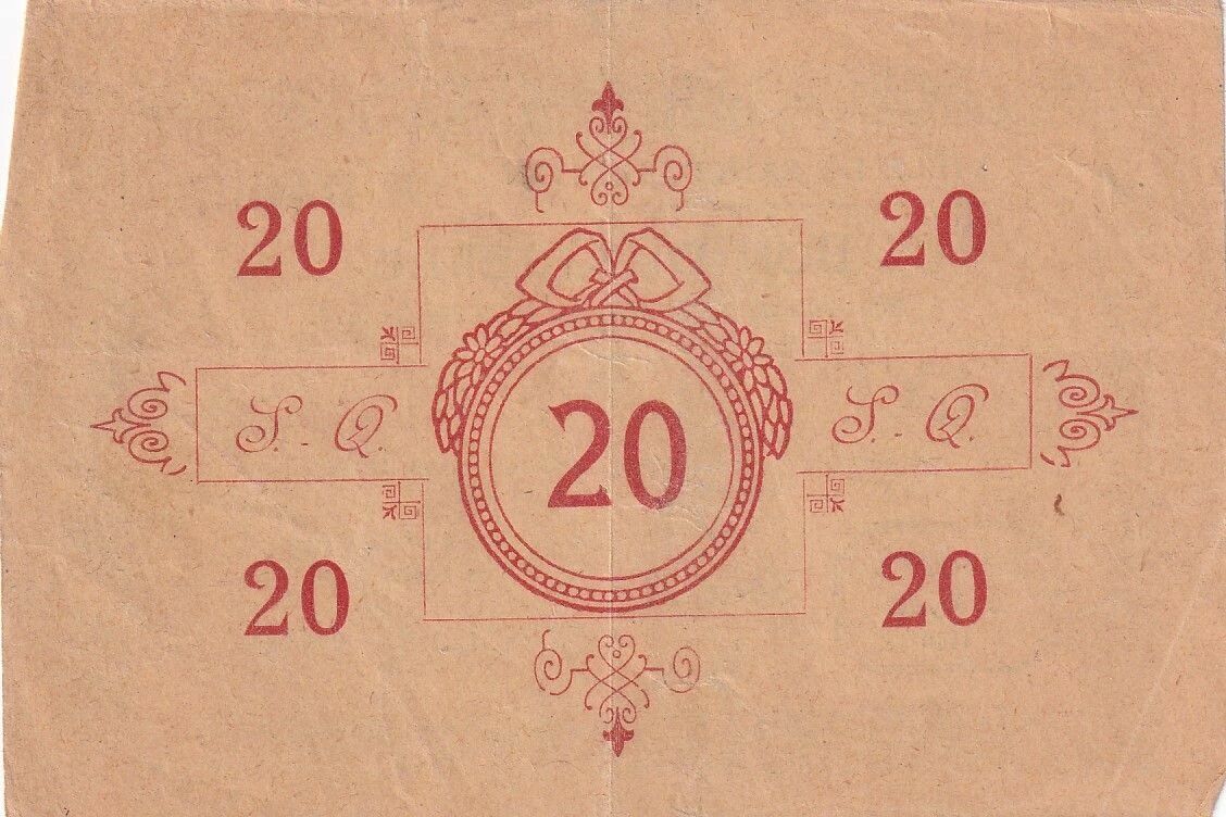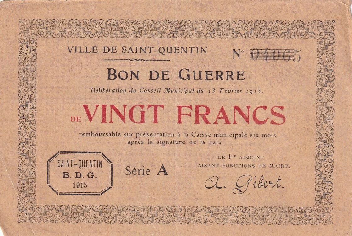 This 20-franc note is a war bond issued by the city of Saint-Quentin, France. The issuance of this note was authorized by a deliberation of the Municipal Council dated February 13, 1915. It is one of the first issues of "War Bonds".