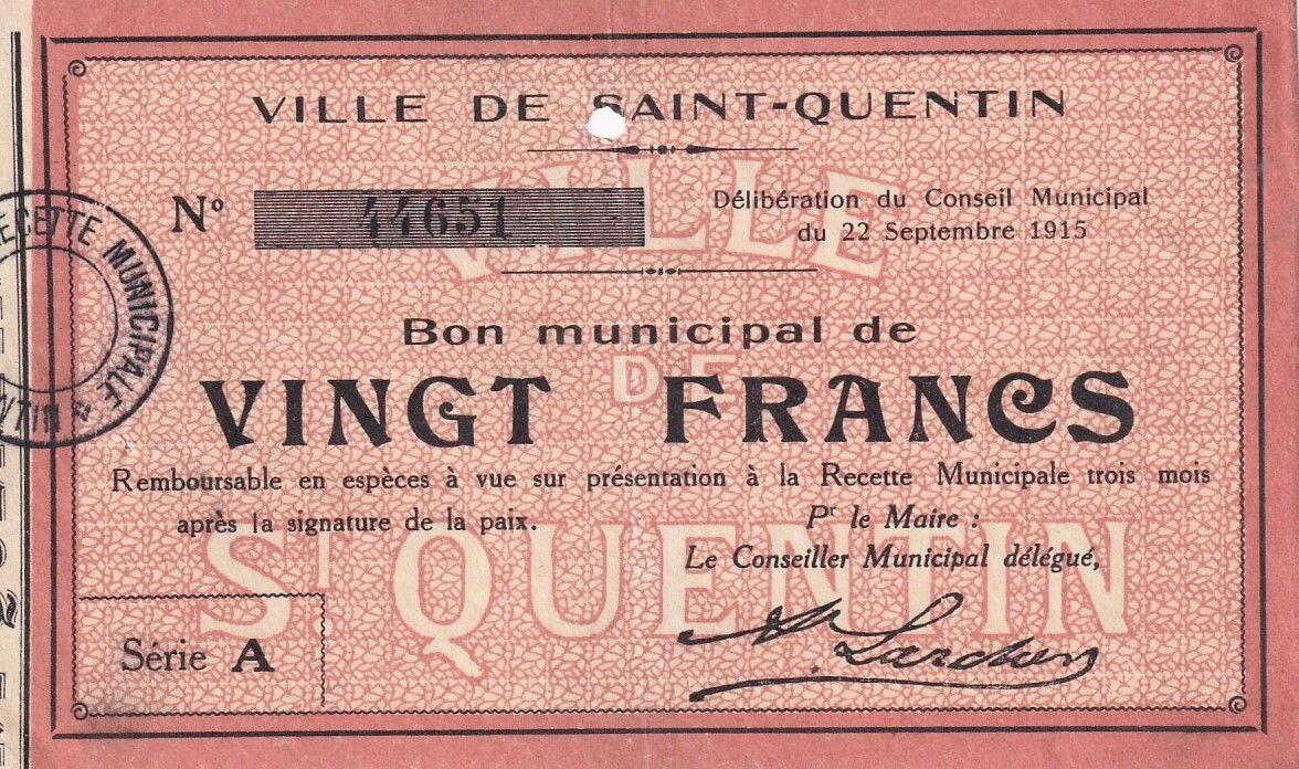 This banknote is an issue of the City of Saint-Quentin, dated September 22, 1915, during the First World War. It is a municipal bond with a value of 20 francs.