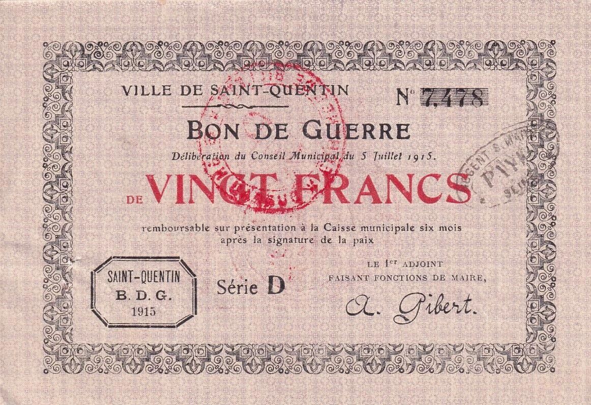 Ce billet de banque est une émission de la ville de Saint-Quentin, datée du 27 mars 1915, et fait partie de la série C. Il s'agit d'un "Bon de Guerre" émis par la Ville de Saint-Quentin.