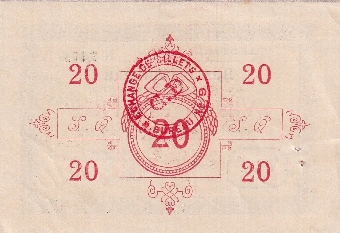 This 20 franc note is a war bond issued by the city of Saint-Quentin, dated March 27, 1915, and belongs to Series D. It was authorized by deliberation of the Municipal Council on July 5, 1915.
