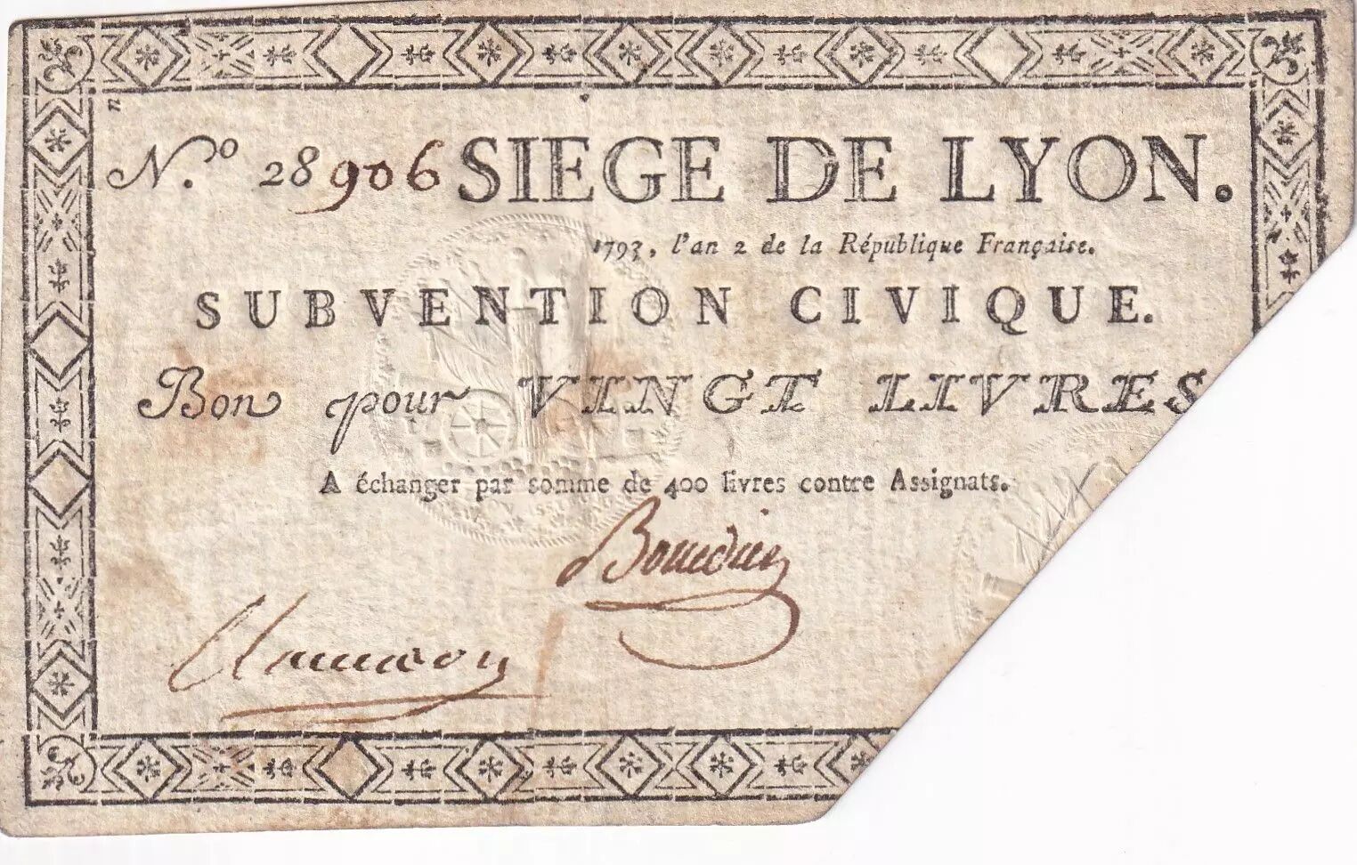 Banknote France 20 Livres Siège de Lyon - 31-08-1793 - n° 28906