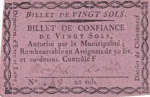 Banknote France 20 Sols - Eure et Loir - Municipalité de Chateauneuf - 1792