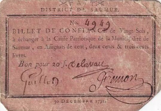 Home > French Banknotes > Necessity Money (1789-1945) > Confidence Notes 1789-1793 > France 20 Sols - Maine et loire - District de Saumur - 30-12-1791