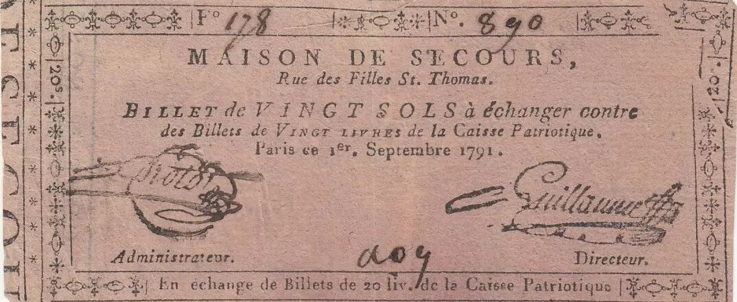 Billet France 20 sols - Maison de secours, rue des filles St. Thomas - 01-09-1791