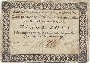 Banknote France 20 Sols - Manche - Patriotic fund of the municipality of Saint Laurent de Cuve - 1794