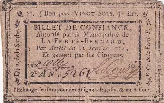 Banknote France 20 Sols - Sarthe - Municipalité de La-Ferté-Bernard - 12-01-1792