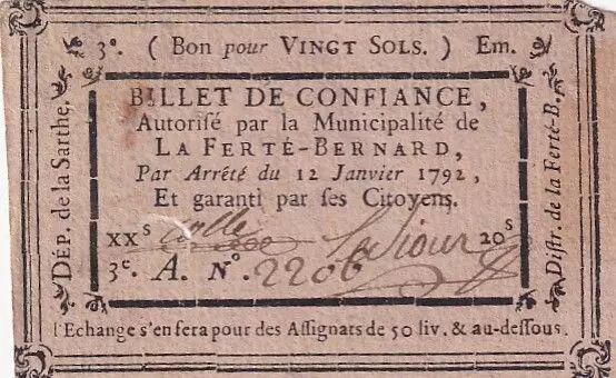 Home > French Banknotes > Necessity Money (1789-1945) > Confidence Notes 1789-1793 > France 20 Sols - Sarthe - Municipalité de La-Ferté-Bernard - 12-01-1792