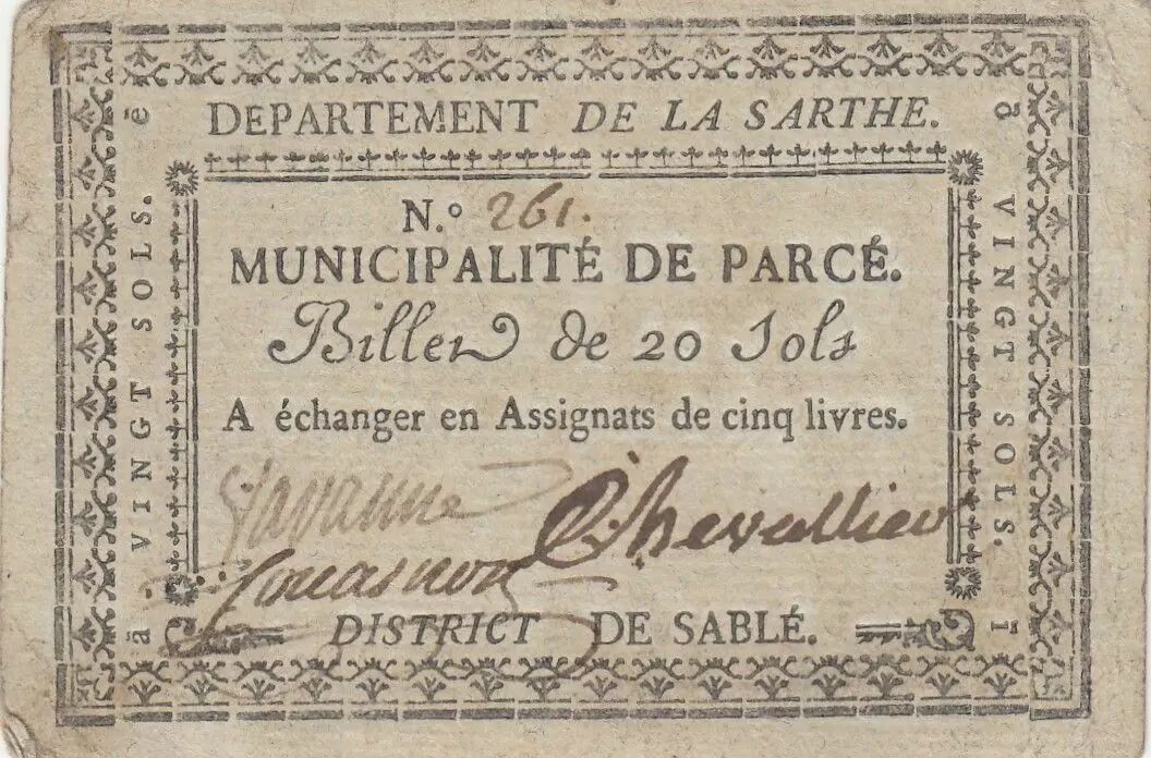Billet France 20 sols - Sarthe - Municipalité de Parcé - 1792