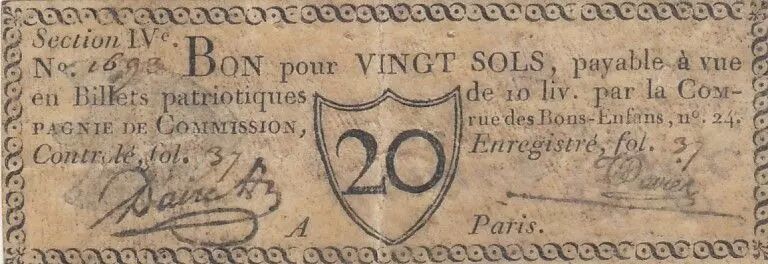 Banknote France 20 sols - Seine - Paris - Compagnie de Commission - 1792