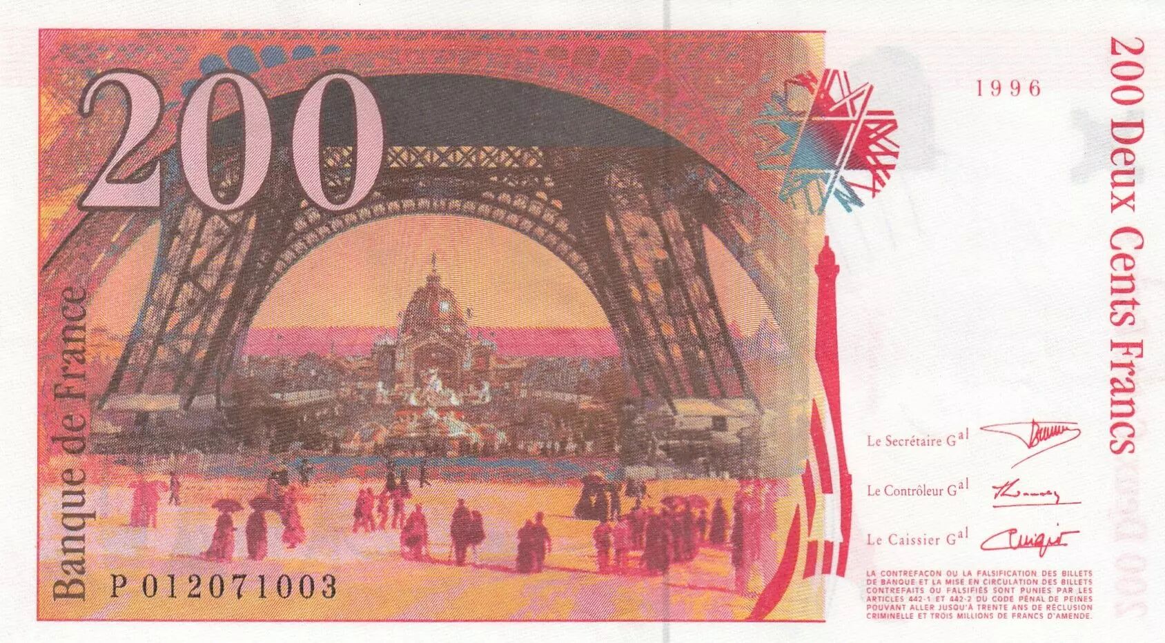 Home > French Banknotes > Bank of France Banknotes > 200 Francs Banknotes > Eiffel type 1995 (1995-1999) > France 200 Francs - Gustave Eiffel - Eiffel tower- 1996 - Serial P.012