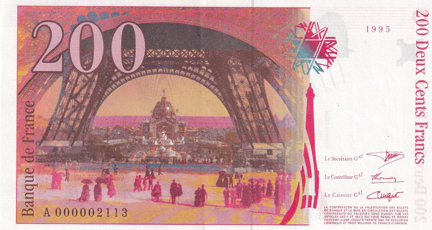 Accueil > Archivage > France 200 Francs - Gustave Eiffel - Tour Eiffel - 1995 - Petit numéro A 000002113 - F.75.01
