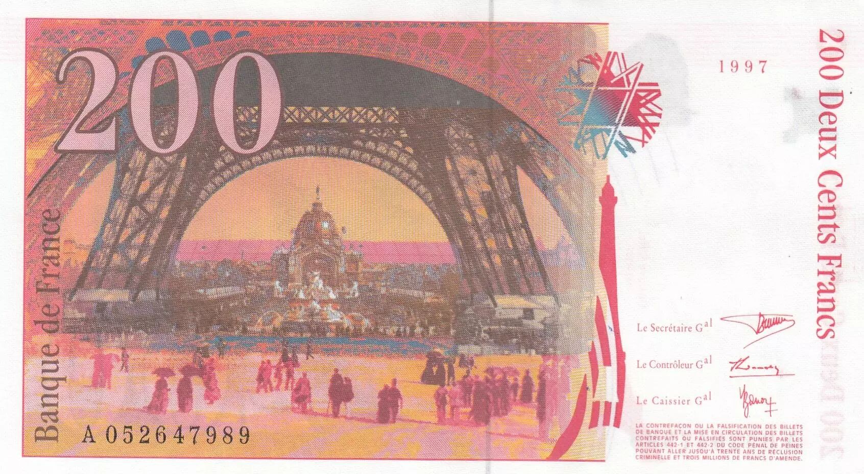 Home > French Banknotes > Bank of France Banknotes > 200 Francs Banknotes > France 200 Francs - Gustave Eiffel - Tour Eiffel - 1996 - Serial A.052