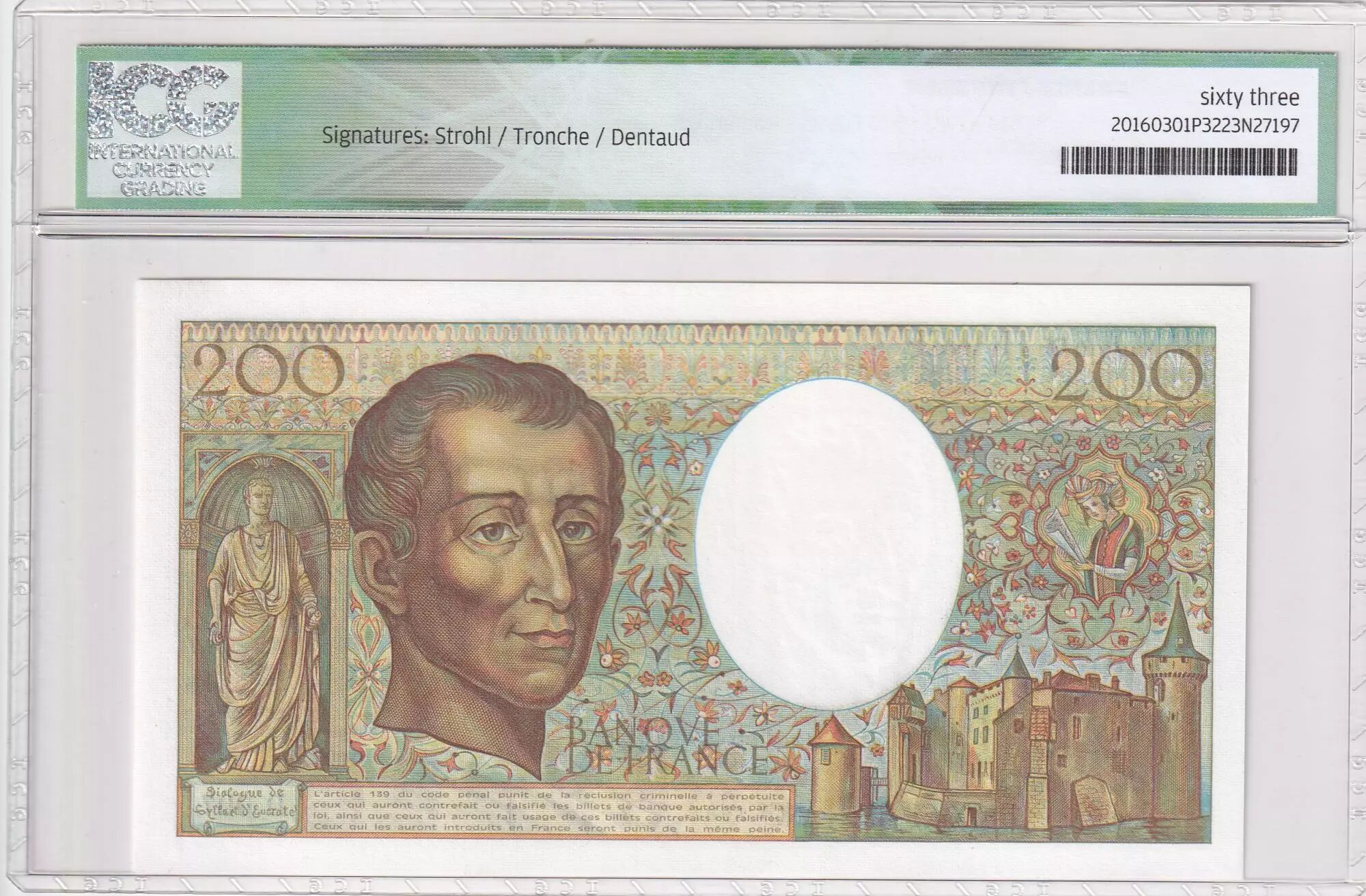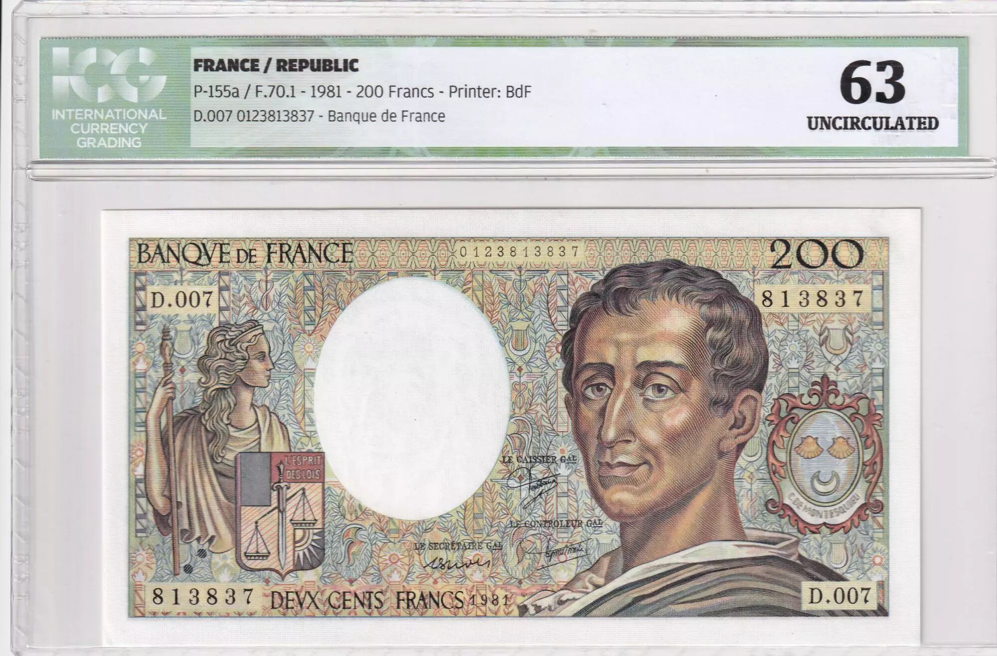 Home > French Banknotes > Bank of France Banknotes > 200 Francs Banknotes > Montesquieu Type 1981 (1981-1988) > France 200 Francs - Montesquieu - 1981 - Serial D.007 - ICG 63UNC