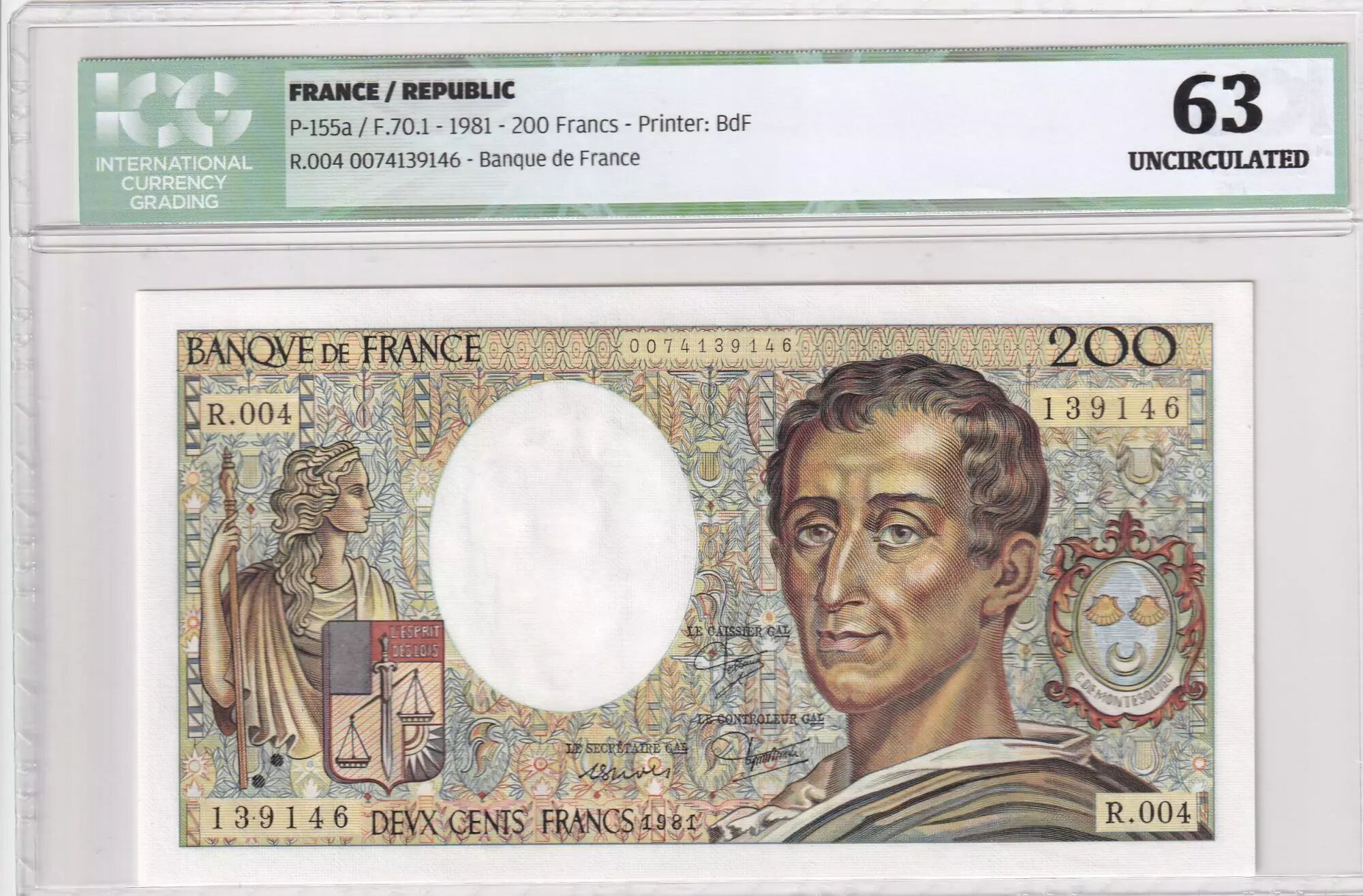 Home > French Banknotes > Bank of France Banknotes > 200 Francs Banknotes > Montesquieu Type 1981 (1981-1988) > France 200 Francs - Montesquieu - 1981 - Serial R.004 - ICG 63UNC