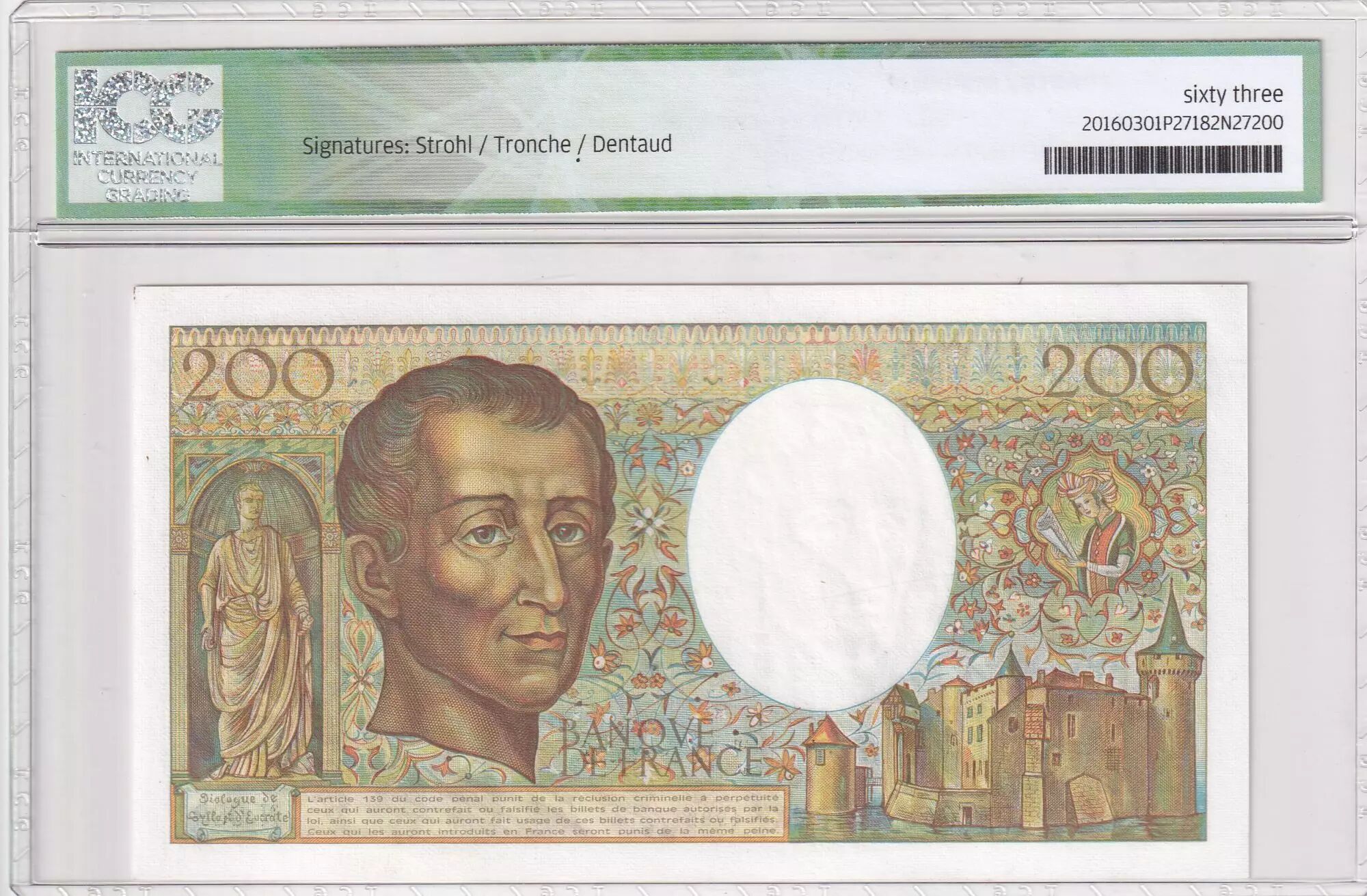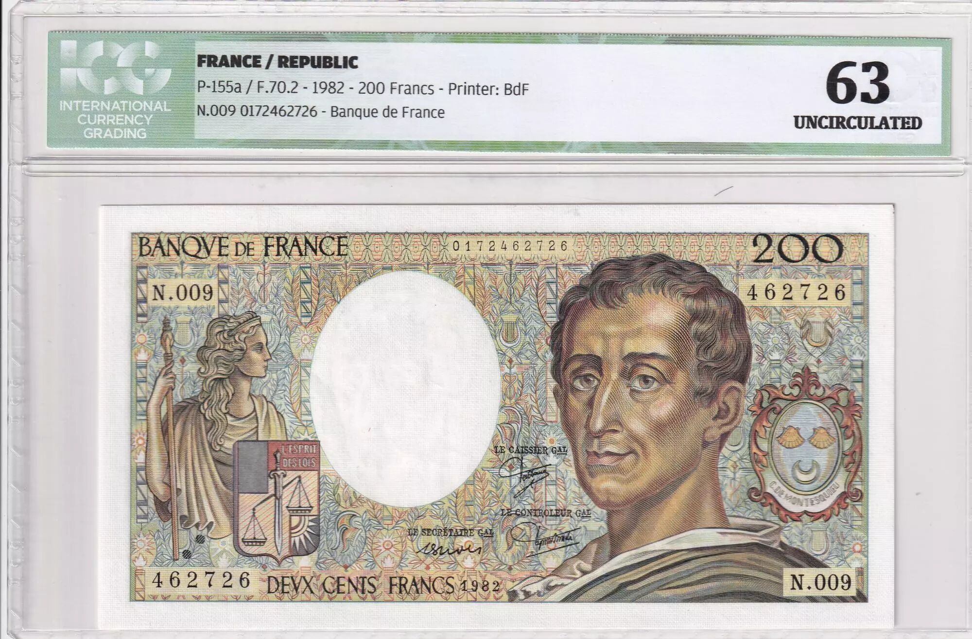 Banknote France 200 Francs - Montesquieu - 1982 - Serial N009 - ICG 63UNC