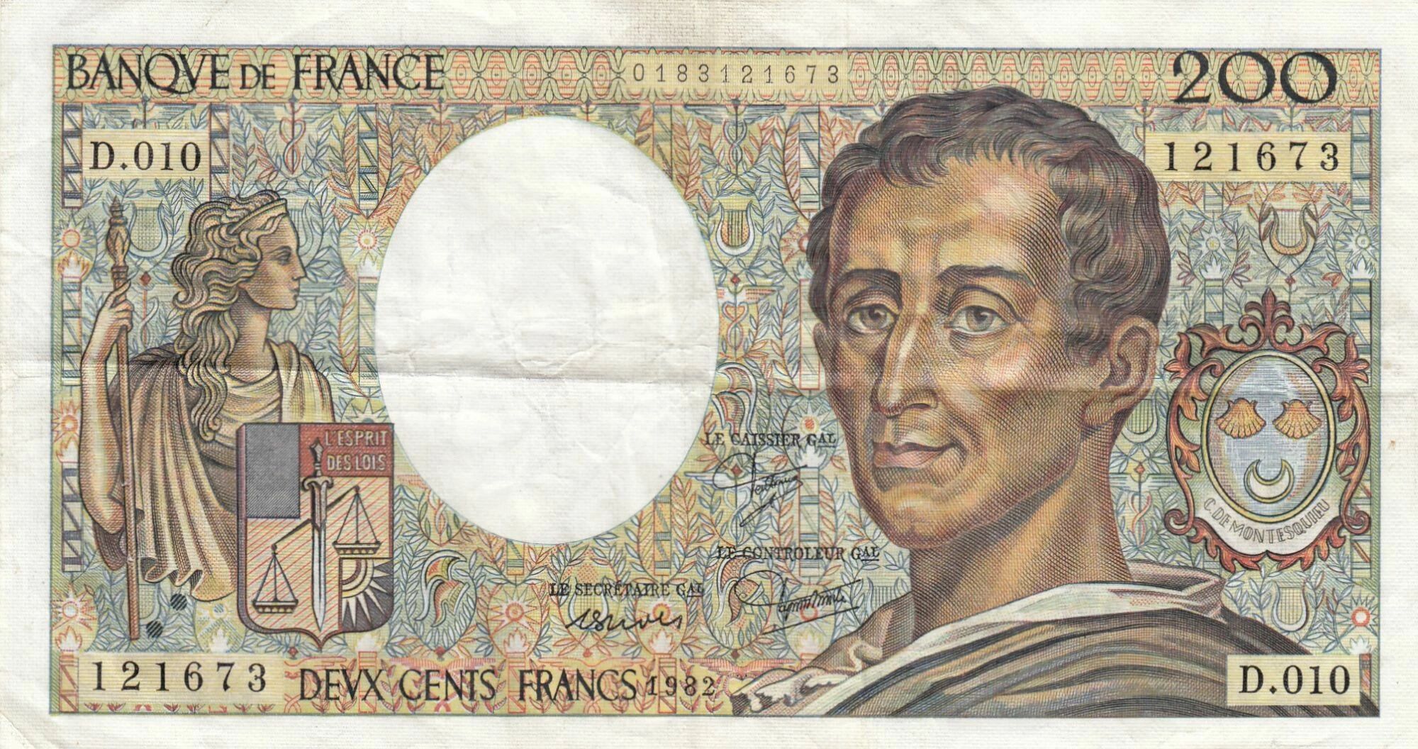 Fiche numismatique du billet de 200 francs Montesquieu, émis en 1982, Série D.010 :