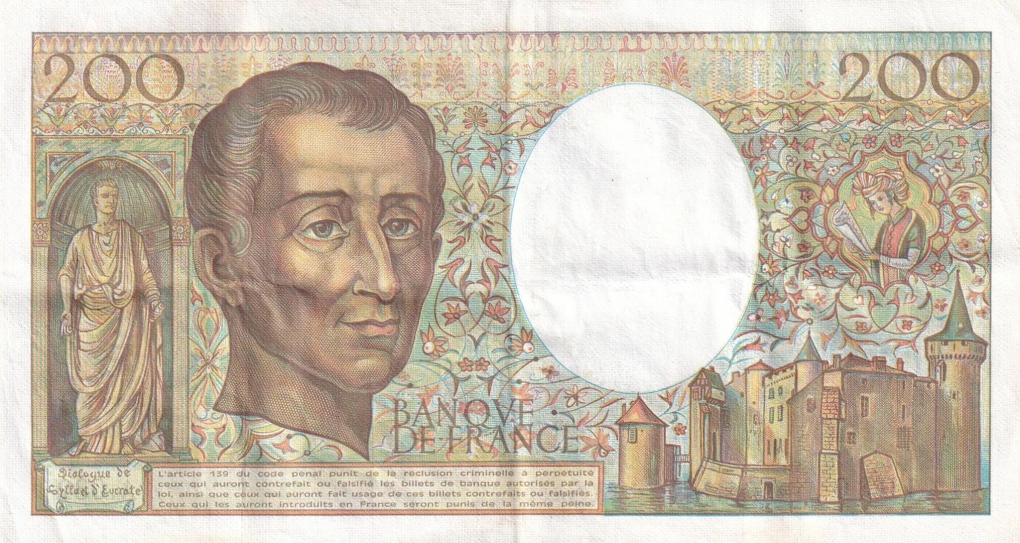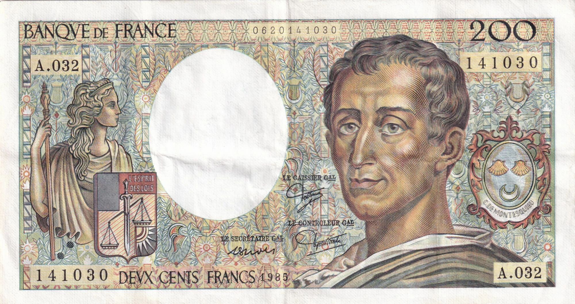 Le billet de 200 francs ?Montesquieu? daté de 1985, série A.032, appartient à la phase de pleine diffusion de ce type emblématique de la Banque de France, introduit à la fin des années 1970. Il s?inscrit dans une période où les billets français se distinguent par leur richesse artistique et leur dimension culturelle.