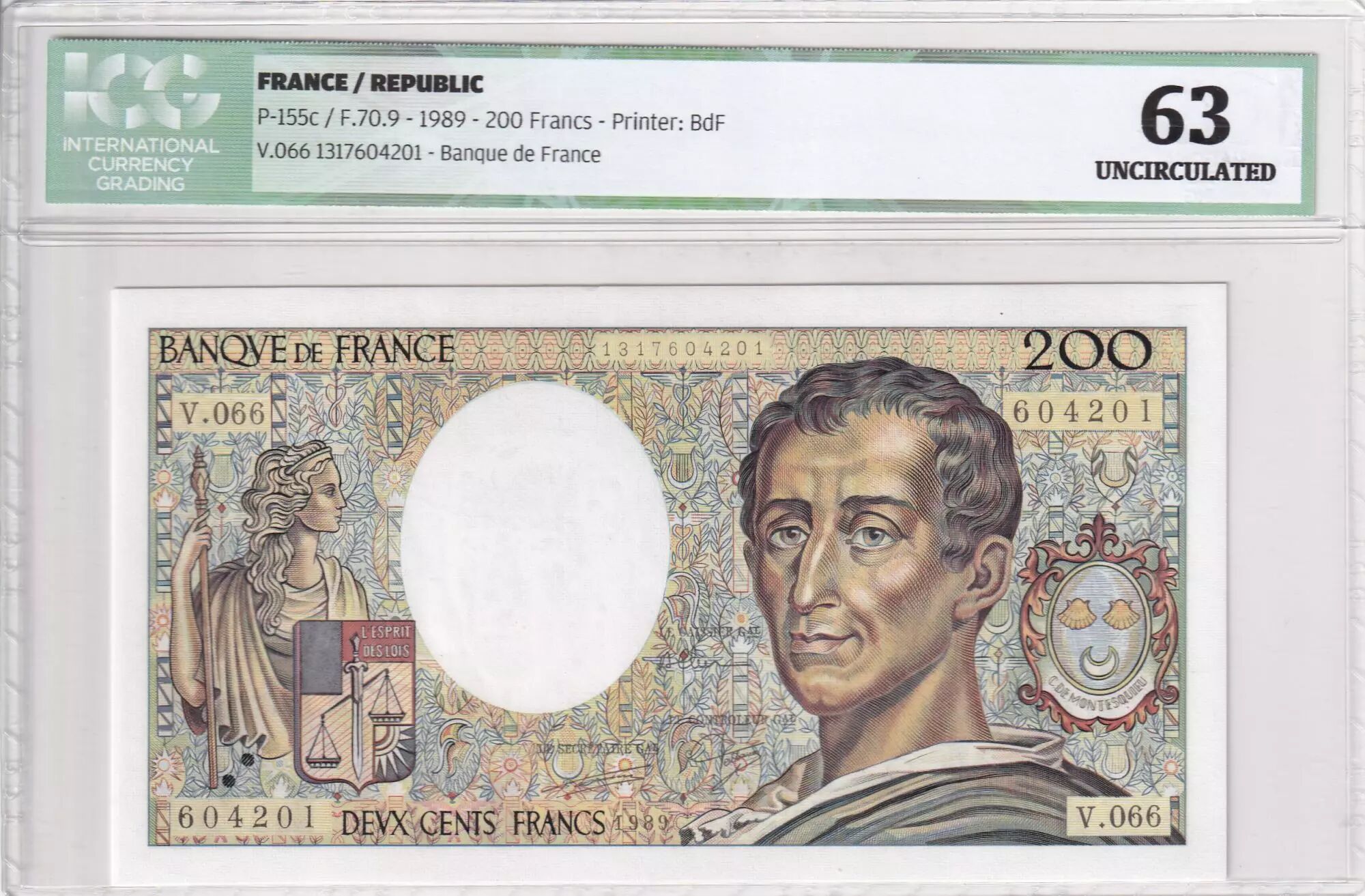 Home > French Banknotes > Bank of France Banknotes > 200 Francs Banknotes > Montesquieu Type 1981 (1981-1988) > France 200 Francs - Montesquieu - 1989 - Serial E.V.066 - ICG 63UNC