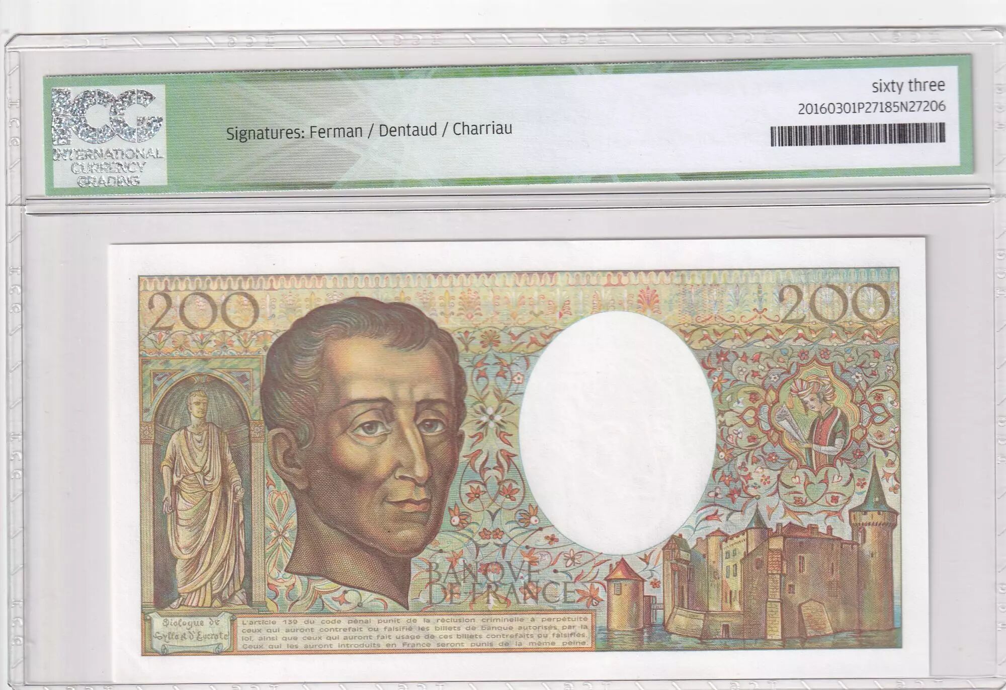 Banknote France 200 Francs - Montesquieu - 1989 - Serial E.V.066 - ICG 63UNC