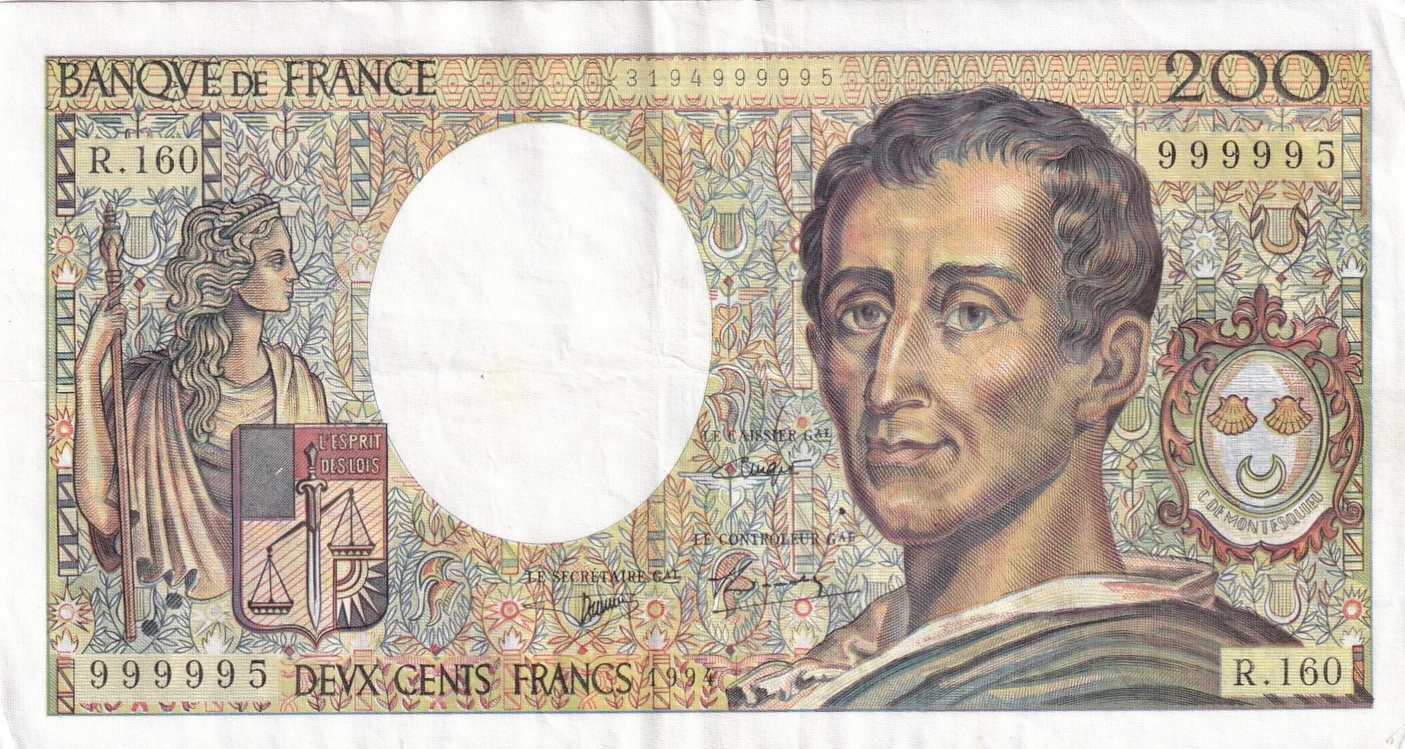 The 200 Francs ?Montesquieu? banknote dated 1994, series R.160, belongs to the final circulation phase of this iconic Banque de France type. Introduced in the late 1970s, it remained in use until the approach of the Euro, embodying the graphic and cultural excellence of French banknotes at the end of the 20th century.