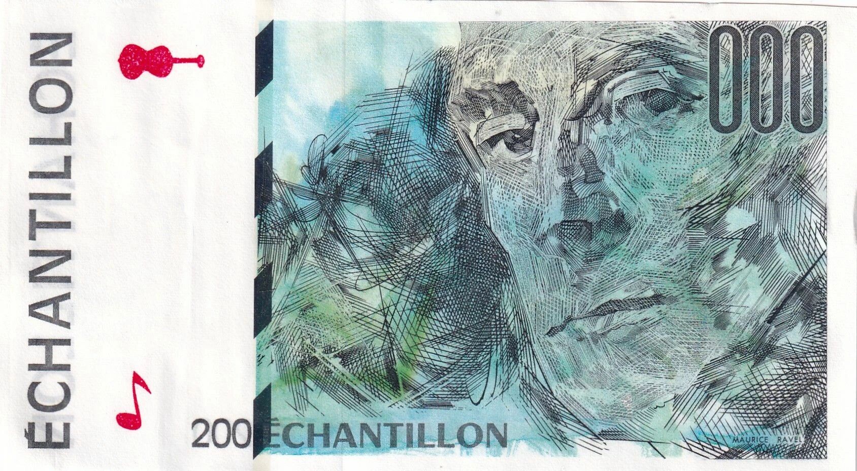 The obverse of the note features a portrait of Maurice Ravel, a French composer born in 1875. There is also an image of a violin and a musical note. The inscriptions "ÉCHANTILLON", "000" and "200 ÉCHANTILLON" are printed on this side. The writing used is Latin.