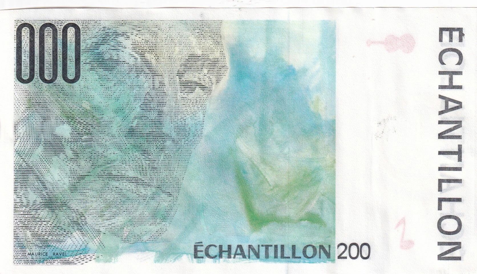 This banknote is a sample of 200 Francs, issued in France between 1992 and 2001. It is an Eiffel type note, dedicated to Maurice Ravel.