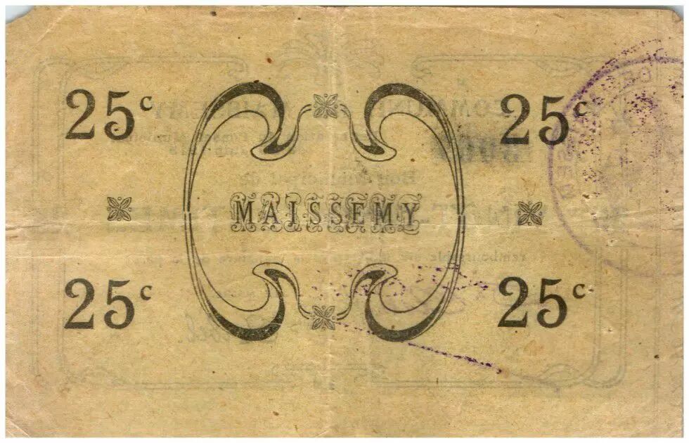 Banknote France 25 cent. Maissemy City - N3067 - 1915