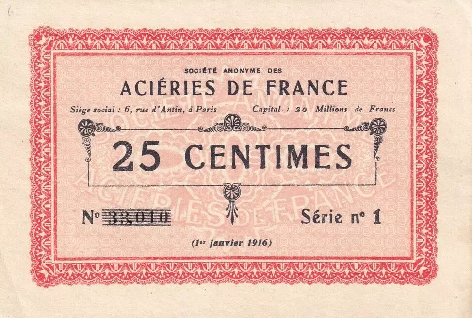 Ce billet de nécessité, émis en France, présente une valeur nominale de 25 centimes. Il a été émis le 1er janvier 1916 par la Société anonyme des Aciéries de France.