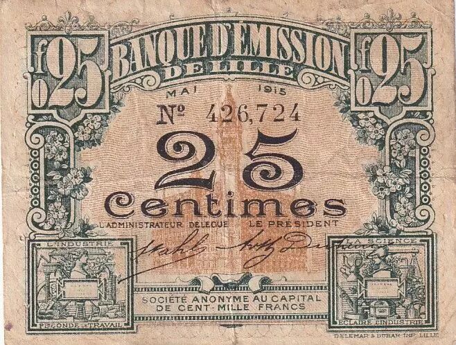 On the front, you can read "BANQUE D’ÉMISSION DE LILLE" at the top of the note, followed by "MAI 1915" and the face value "25 CENTIMES". The signatures of the managing director and the president also appear on the front. The mention "SOCIÉTÉ ANONYME AU CAPITAL DE CENT - MILLE FRANCS" is printed at the bottom. Two illustrated frames are located at the bottom left and right. The one on the left bears the inscription "L'INDUSTRIE FÉCONDE LE TRAVAIL", while the one on the right indicates "LA SCIENCE ÉCLAIRE L'INDUSTRIE". The name of the printer, "DELEMAR & DUBAR IMP. LILLE", is also present.