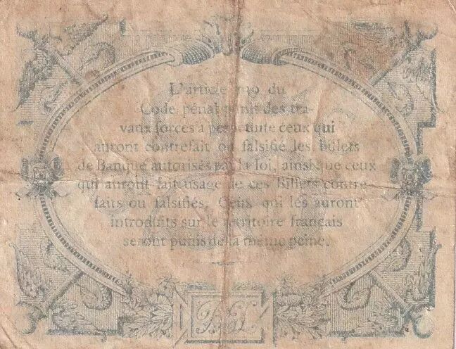 The back of the note contains an excerpt from Article 139 of the Penal Code. This article stipulates that the counterfeiting or falsification of banknotes authorized by law is punishable by forced labor for life. The same penalty applies to those who use or introduce such counterfeit or falsified notes on French territory.