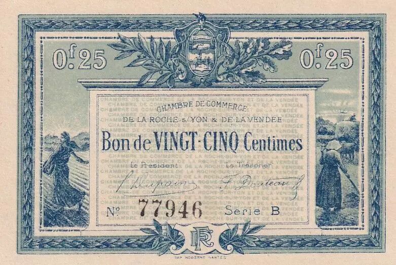 Ce billet de banque français, d'une valeur nominale de 25 centimes, a été émis en 1916 par la Chambre de Commerce de La Roche-sur-Yon et de la Vendée. Il s'agit d'un bon, faisant partie de la Série B, conçu pour faciliter les échanges commerciaux en période de pénurie de monnaie.