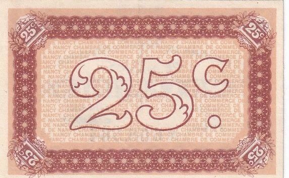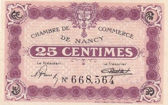Ce billet de 25 centimes émis par la Chambre de Commerce de Nancy est un témoignage de l'histoire économique locale française. Le recto du billet présente l'inscription "CHAMBRE DE COMMERCE DE NANCY" en lettres capitales, soulignant l'institution émettrice. La valeur nominale, "25 CENTIMES", est clairement indiquée, accompagnée des mentions "Le Président" et "Le Trésorier", suggérant les signatures des responsables de l'émission. Un numéro de série, "N° 668.564", est également présent, servant à l'identification unique du billet. Le nom de l'imprimeur, "BERGER-LEVRAULT NANCY-PARIS-STRASBOURG", figure en bas, indiquant l'entreprise responsable de la production du billet.