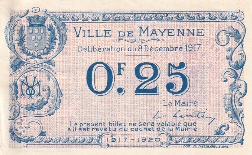 This French emergency banknote has a nominal value of 25 centimes. It was issued on December 8, 1917.