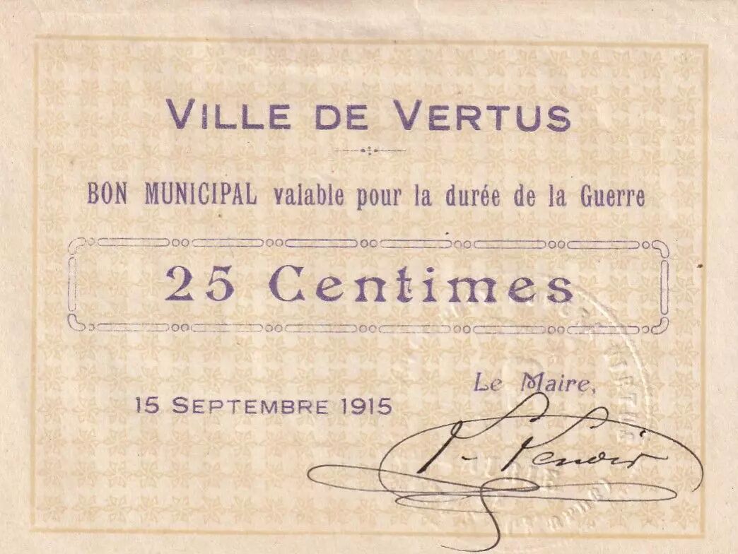 Banknote France 25 Centimes - City of Vertus - 15-09-1915