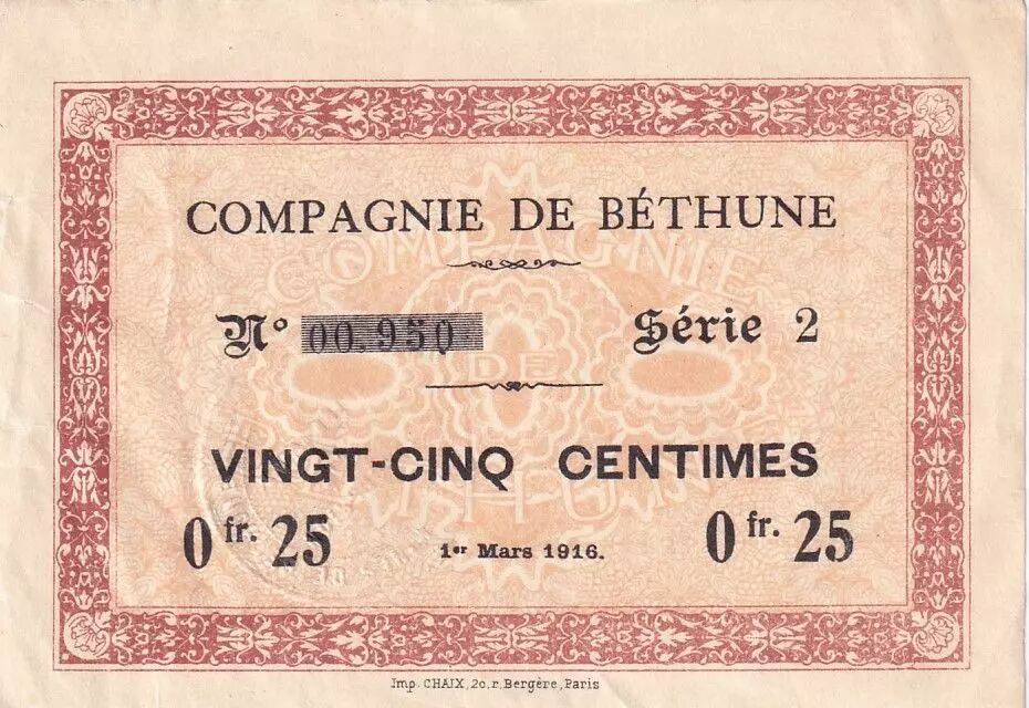 Ce billet de nécessité français possède une valeur nominale de 25 centimes. Il a été émis le 1er mars 1916 par la Compagnie de Béthune, durant la période des Nécessités Communes et Villes de 1914 à 1918.