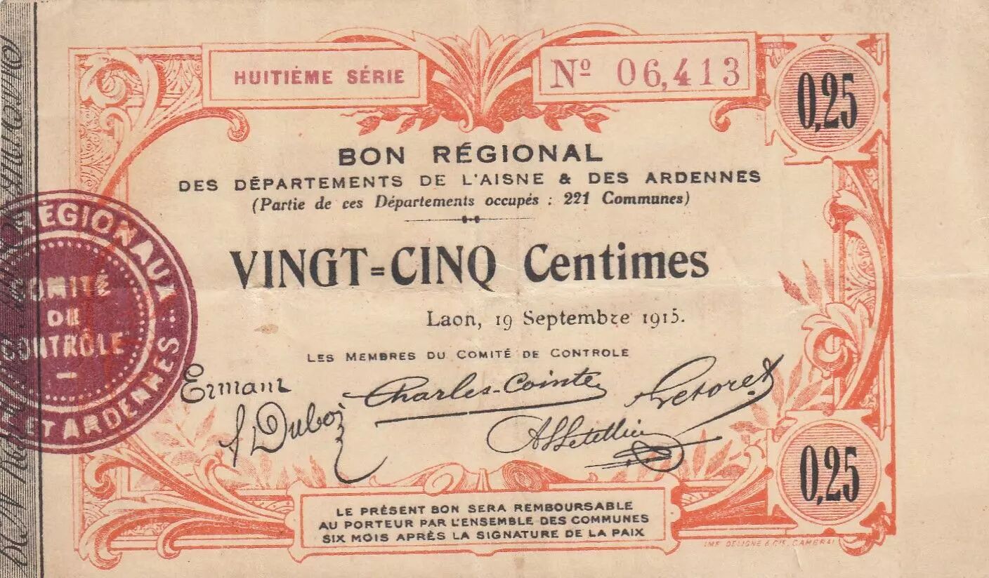 Accueil > Archivage > archivage-Billets Français > France 25 Centimes - Laon - Bon Régional - 19-09-1915 - Huitième série