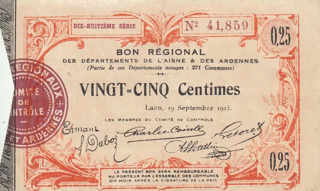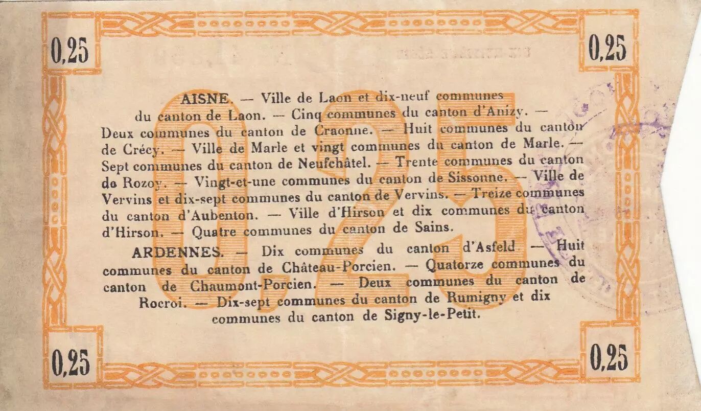 Accueil > Billets Français > Billets de Nécessités (1789-1945) > Bons de villes et de communes 1914-1925 > France 25 Centimes - Laon - Bon Régional - 19-09-1915 - Quatrième série