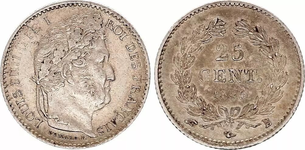 Home > French coins (470 à 2002) > Modern Currencies (1789 to 2002) > 25 Centimes 1/4 Franc > France 25 Centimes Louis Philippe I - 1845 B Rouen - Silver