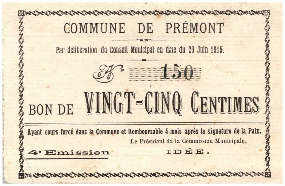 Billet France 25 Centimes Premont Commune - 4ème émission N150 - 1915