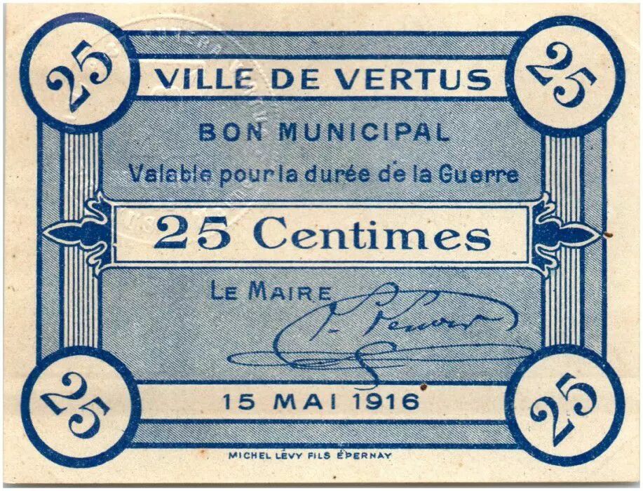 Banknote France 25 Centimes Vertus City - 1916