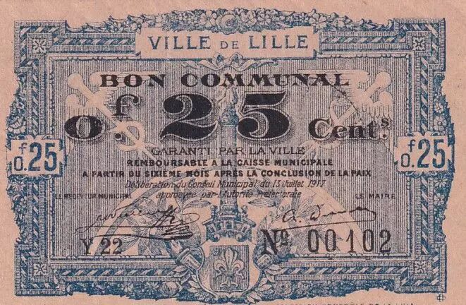 Ce billet de 25 centimes est un bon communal émis par la Ville de Lille, daté du 13 juillet 1917, et appartient à la série Y22. Il s'agit d'une forme de monnaie locale émise en période de difficultés économiques, probablement liées au contexte de la Première Guerre mondiale.