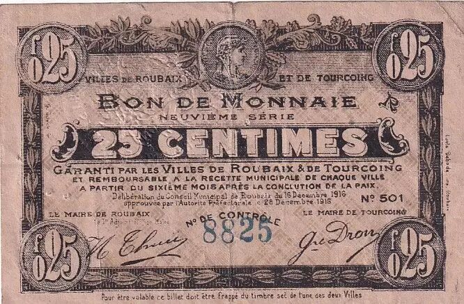 Sur le recto du billet, on peut lire "Villes de Roubaix et de Tourcoing" en haut, suivi de la mention "Bon de Monnaie". La valeur nominale de "25 Centimes" est clairement indiquée. Une garantie est stipulée, assurant que le billet est garanti par les villes de Roubaix et de Tourcoing et remboursable à la recette de chaque ville à partir du sixième mois après la conclusion de la paix. La délibération du conseil municipal de Roubaix du 16 décembre 1916 et l'approbation de l'autorité préfectorale du 28 décembre 1916 sont également mentionnées, soulignant la légitimité de l'émission. Le numéro de contrôle est 8825 et un numéro de série unique, N°501, est imprimé sur chaque billet. Les signatures du maire de Roubaix et du maire de Tourcoing y figurent aussi. Une instruction précise que, pour être valable, le billet doit être frappé du timbre sec de l'une des deux villes. Le nom de l'imprimeur, Louis Debode de Roubaix, est également mentionné.
