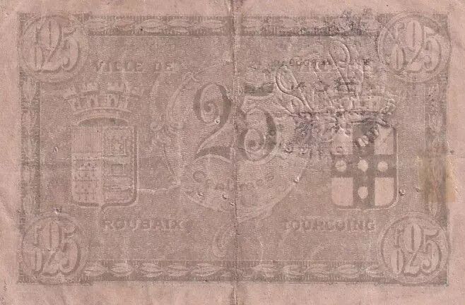 Le verso du billet présente une composition plus simple. On y trouve la valeur nominale "25" au centre, encadrée par les mentions "Ville de Roubaix" et "Ville de Tourcoing". La valeur "0,25" est répétée dans les coins supérieurs et inférieurs du billet.