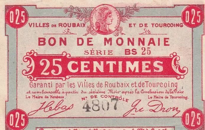 The 25 cent banknote, issued by the cities of Roubaix and Tourcoing, belongs to the BS 25 series. It is written in Latin and its face value is 5 francs.