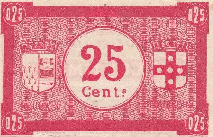 The reverse of the banknote displays the value "0.25" in the upper left and lower right corners. The number "25" is placed in the center, accompanied by the mention "cents.". The names "ROUBAIX" and "TOURCOING" are written one above the other. The value "0.25" is again repeated in the upper right and lower left corners.