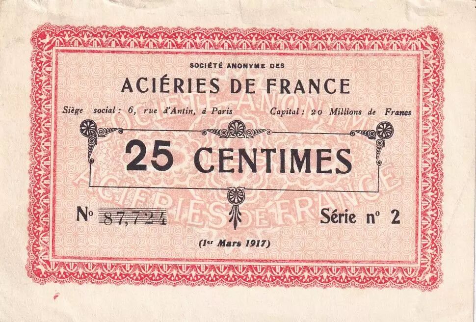 The mention "Aciéries de France" suggests that this company issued this banknote to facilitate economic transactions within its employee community or in its region of establishment. These emergency banknotes were often accepted as a means of payment in local shops, in addition to official currency.