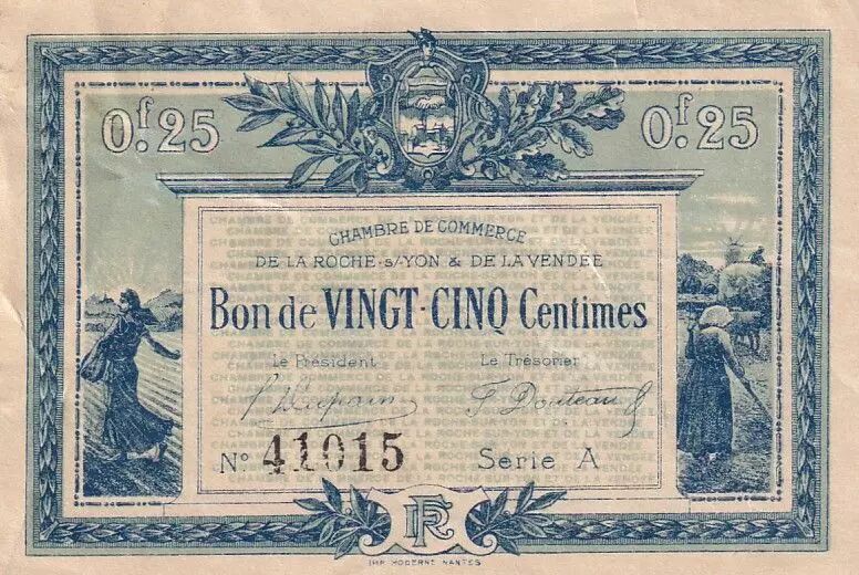 This 25 centime note was issued by the Chamber of Commerce of La Roche-sur-Yon and Vendée in 1916. It is a voucher, not an official banknote issued by the Bank of France.