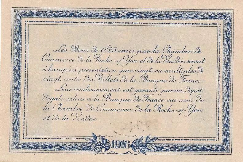 The reverse of the banknote contains a text in cursive script specifying the conditions for exchanging the vouchers. It indicates that the 0.25 franc vouchers issued by the Chamber of Commerce of La Roche-sur-Yon and Vendée will be exchanged for banknotes of the Banque de France in multiples of twenty. It is also specified that their reimbursement is guaranteed by a deposit of equal value at the Banque de France, in the name of the Chamber of Commerce of La Roche-sur-Yon and Vendée. The date "1916" is inscribed at the bottom.