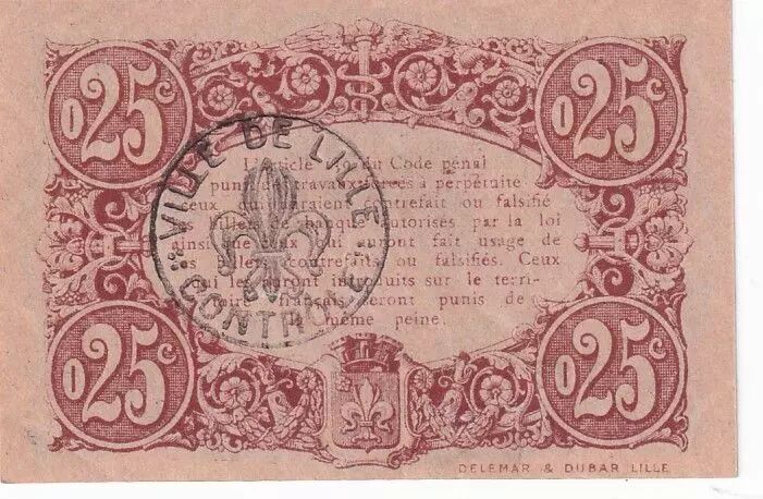 The reverse of the note contains essential legal information. It reproduces Article 189 of the Penal Code, which provides for severe penalties, including forced labor for life, for the counterfeiting or falsification of banknotes authorized by law, as well as for the use of such counterfeit or falsified banknotes. This provision aims to deter any attempt at fraud. The face value "0.25" is repeated on each side. The name of the printer, "DELEMAR & DUBAR LILLE", is also mentioned at the bottom of the note.